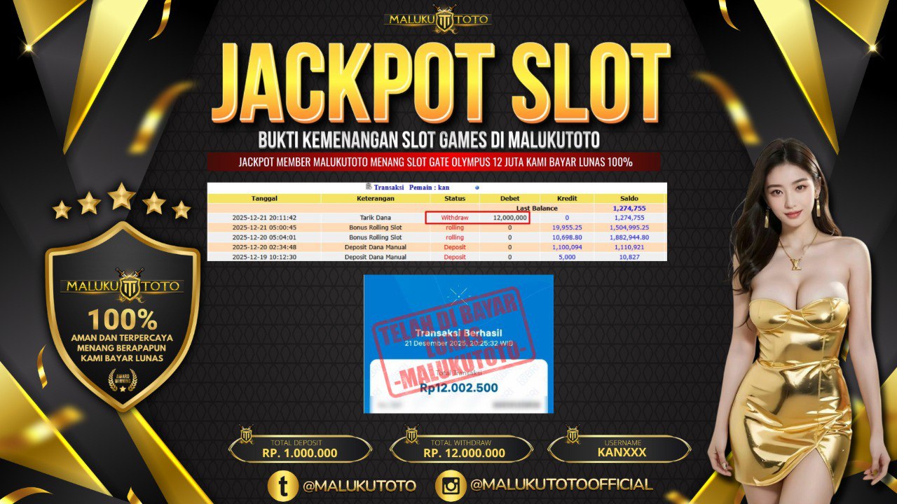 Selamat kepada User id : KAN** Telah berhasil mendapatkan kemenangan besar pada permainan SLOT GATE OF OLYMPUS kemenangan Sebesar Rp. 12.000.000, Setelah mengisi formulir withdraw dengan kurung waktu hanya 3 – 5 menit pihak malukutoto sudah melakukan transfer kepada pemilik Userid dan dana sudah dapat di cairkan oleh pemenang. Bukti pembayaran yang kami berikan merupakan bukti pembayaran yang SAH / VALID yang langung di dapatkan melaui tanda transfer transaksi dari Bank yang di tuju.