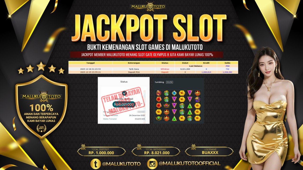 Selamat kepada User id : BUA** Telah berhasil mendapatkan kemenangan besar pada permainan SLOT GATE OF OLYMPUS kemenangan Sebesar Rp. 8.000.000, Setelah mengisi formulir withdraw dengan kurung waktu hanya 3 – 5 menit pihak malukutoto sudah melakukan transfer kepada pemilik Userid dan dana sudah dapat di cairkan oleh pemenang. Bukti pembayaran yang kami berikan merupakan bukti pembayaran yang SAH / VALID yang langung di dapatkan melaui tanda transfer transaksi dari Bank yang di tuju.