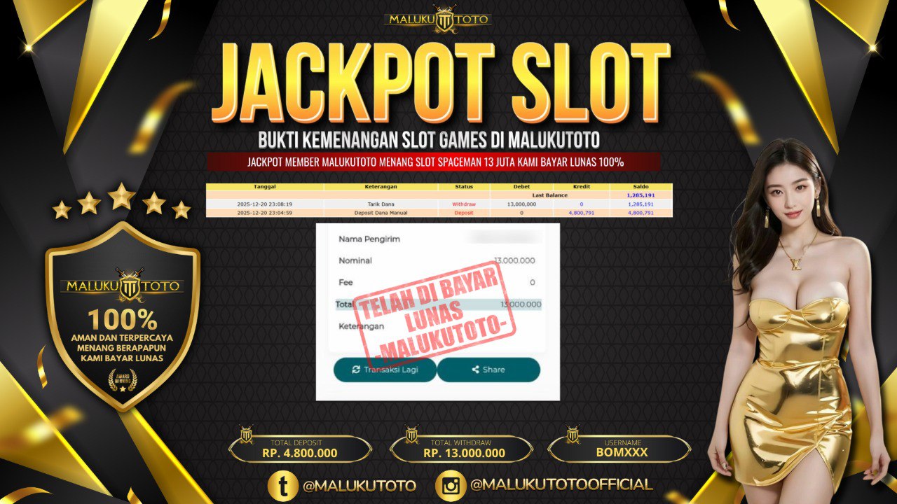 Selamat kepada User id : BOM** Telah berhasil mendapatkan kemenangan besar pada permainan SLOT SPACEMAN kemenangan Sebesar Rp. 13.000.000, Setelah mengisi formulir withdraw dengan kurung waktu hanya 3 – 5 menit pihak malukutoto sudah melakukan transfer kepada pemilik Userid dan dana sudah dapat di cairkan oleh pemenang. Bukti pembayaran yang kami berikan merupakan bukti pembayaran yang SAH / VALID yang langung di dapatkan melaui tanda transfer transaksi dari Bank yang di tuju.