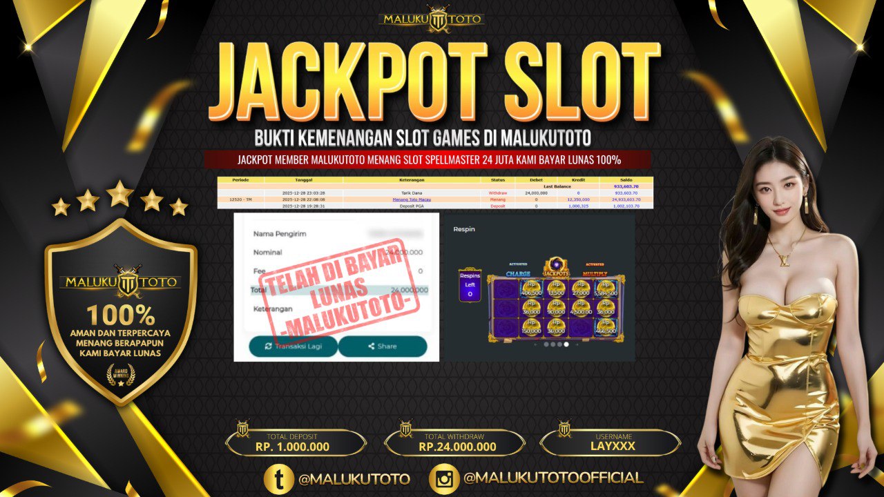 Selamat kepada User id : LAY** Telah berhasil mendapatkan kemenangan besar pada permainan SLOT SPELLMASTER kemenangan Sebesar Rp. 24.000.000, Setelah mengisi formulir withdraw dengan kurung waktu hanya 3 – 5 menit pihak malukutoto sudah melakukan transfer kepada pemilik Userid dan dana sudah dapat di cairkan oleh pemenang. Bukti pembayaran yang kami berikan merupakan bukti pembayaran yang SAH / VALID yang langung di dapatkan melaui tanda transfer transaksi dari Bank yang di tuju.